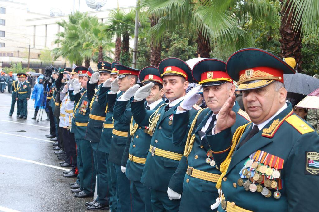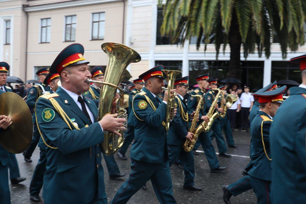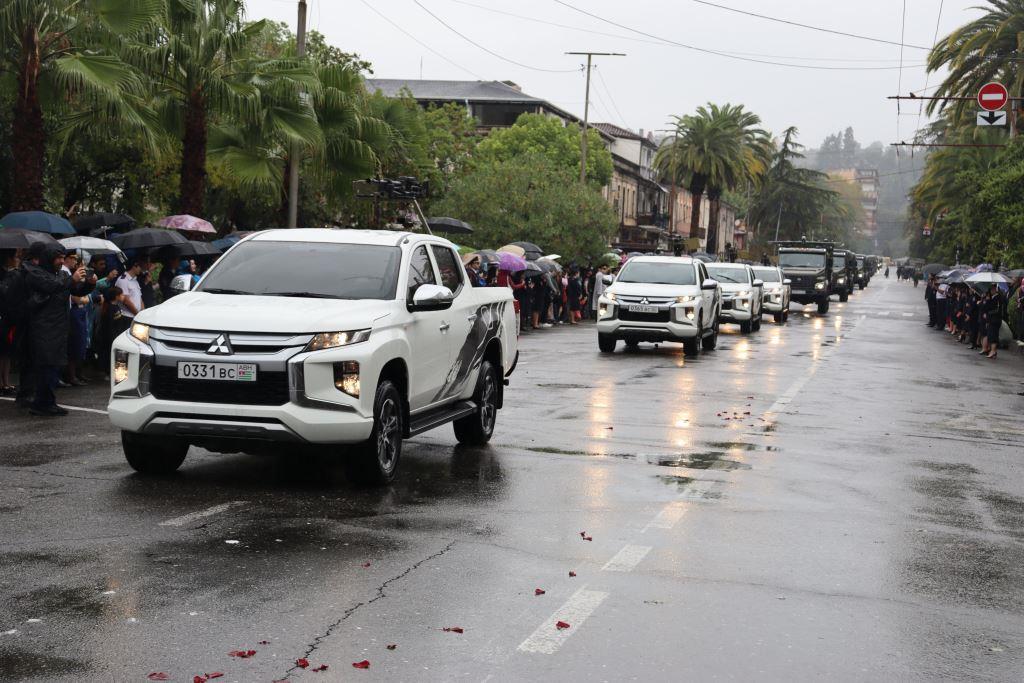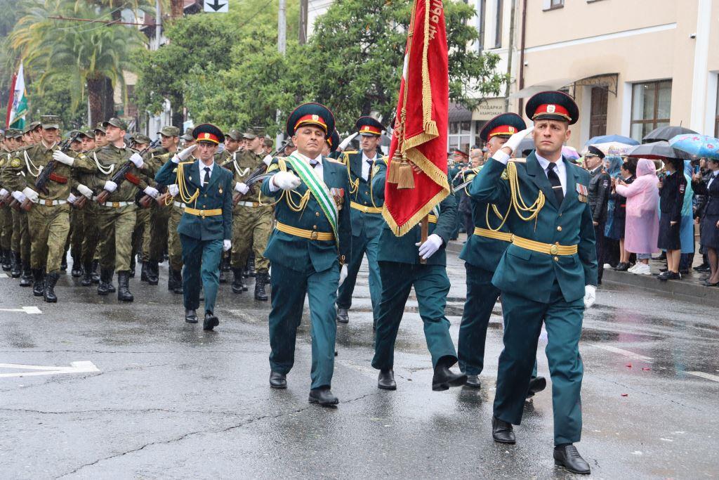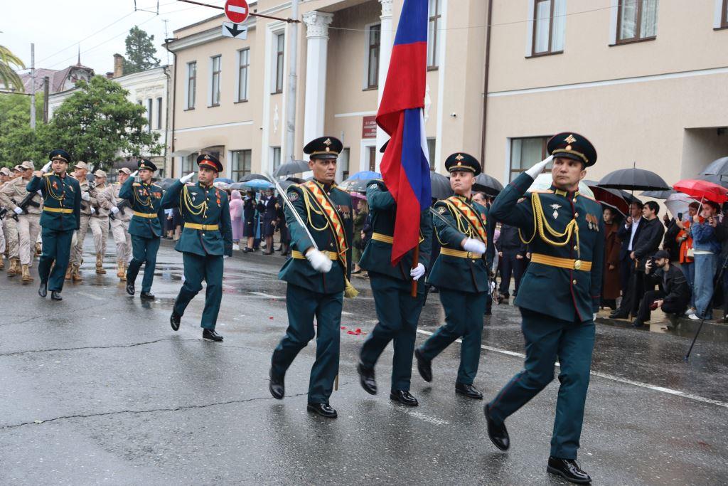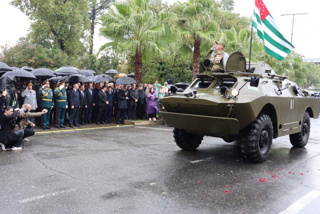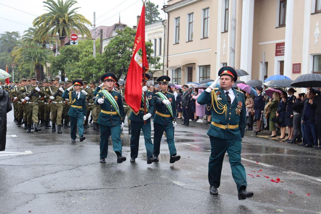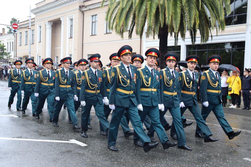 Торжественным маршем по улице Аидгылара прошли парадные расчёты, состоящие из военнослужащих Вооруженных Сил Республики Абхазия и Российской Федерации.