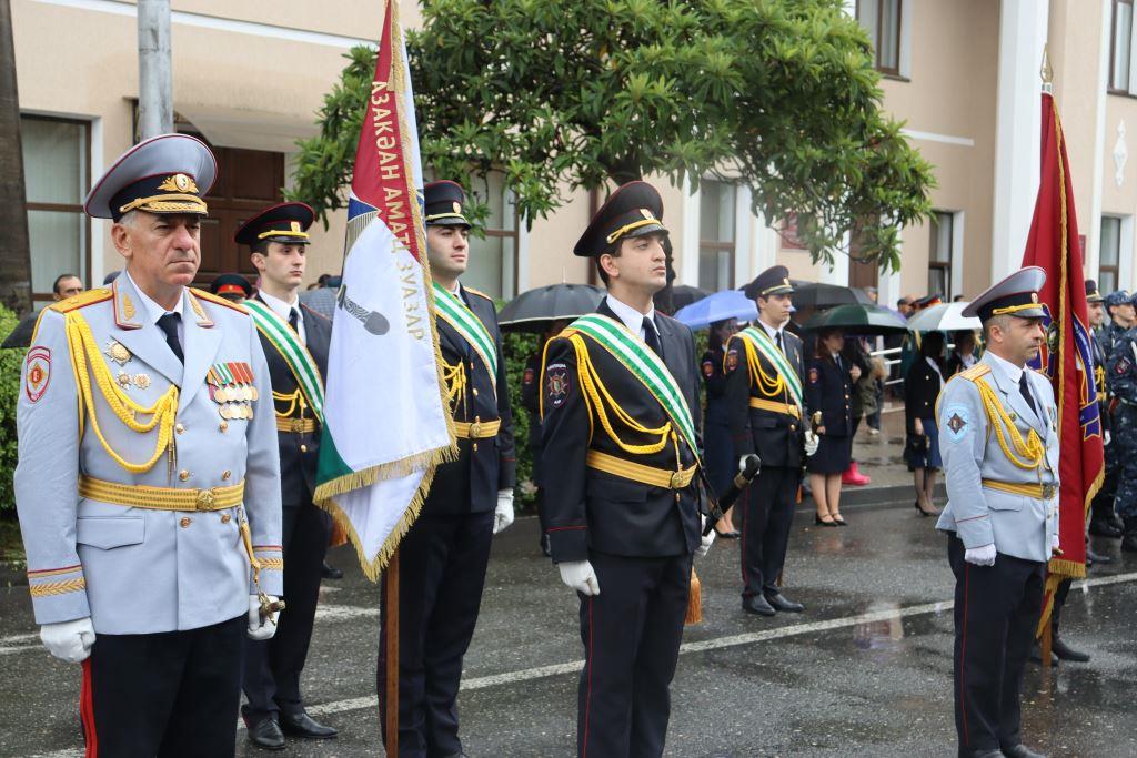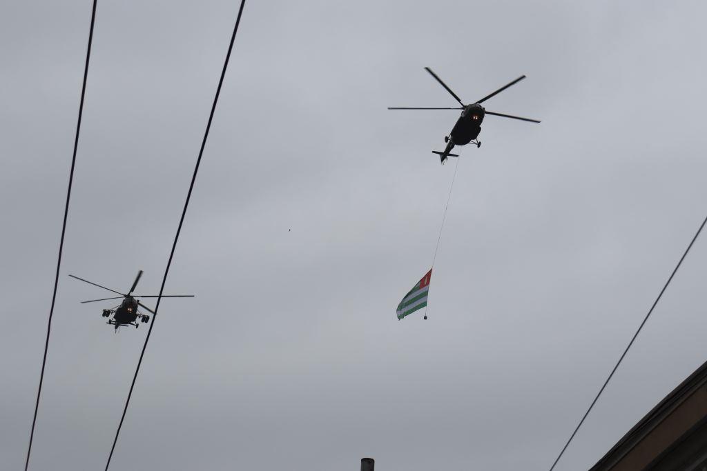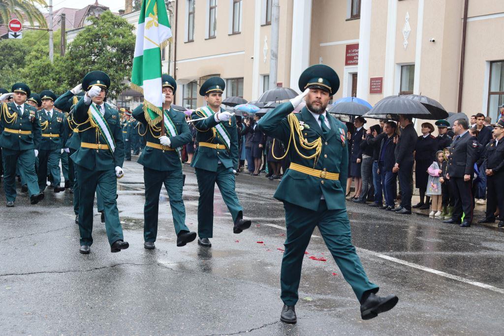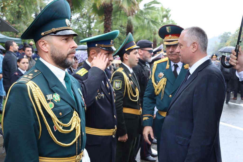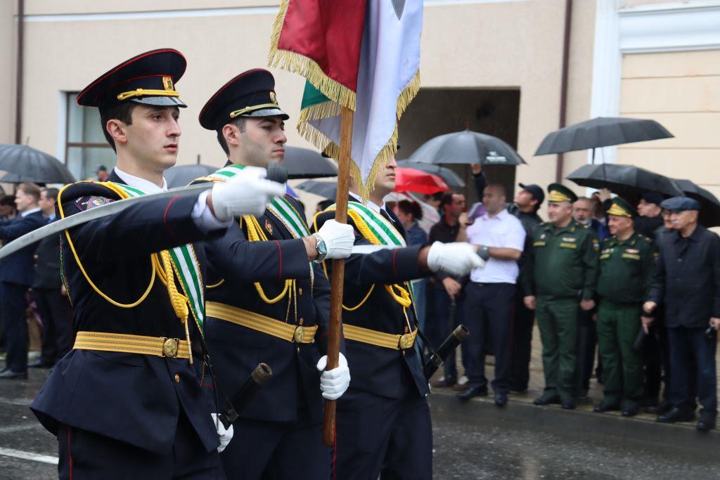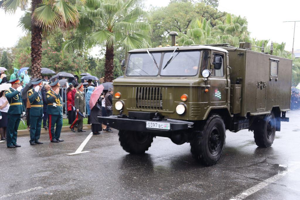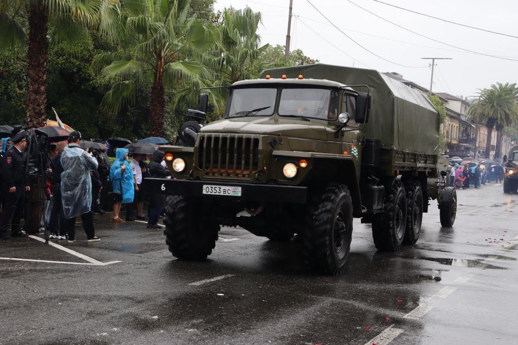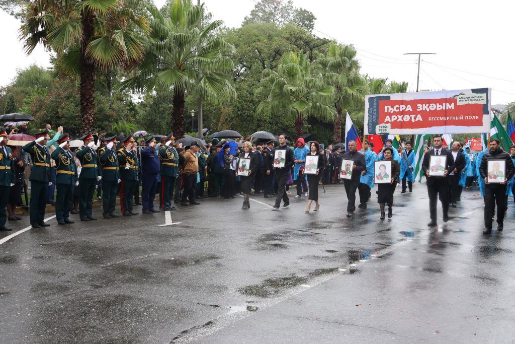 Торжественным маршем по улице Аидгылара прошли парадные расчёты, состоящие из военнослужащих Вооруженных Сил Республики Абхазия и Российской Федерации.