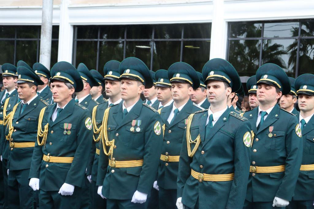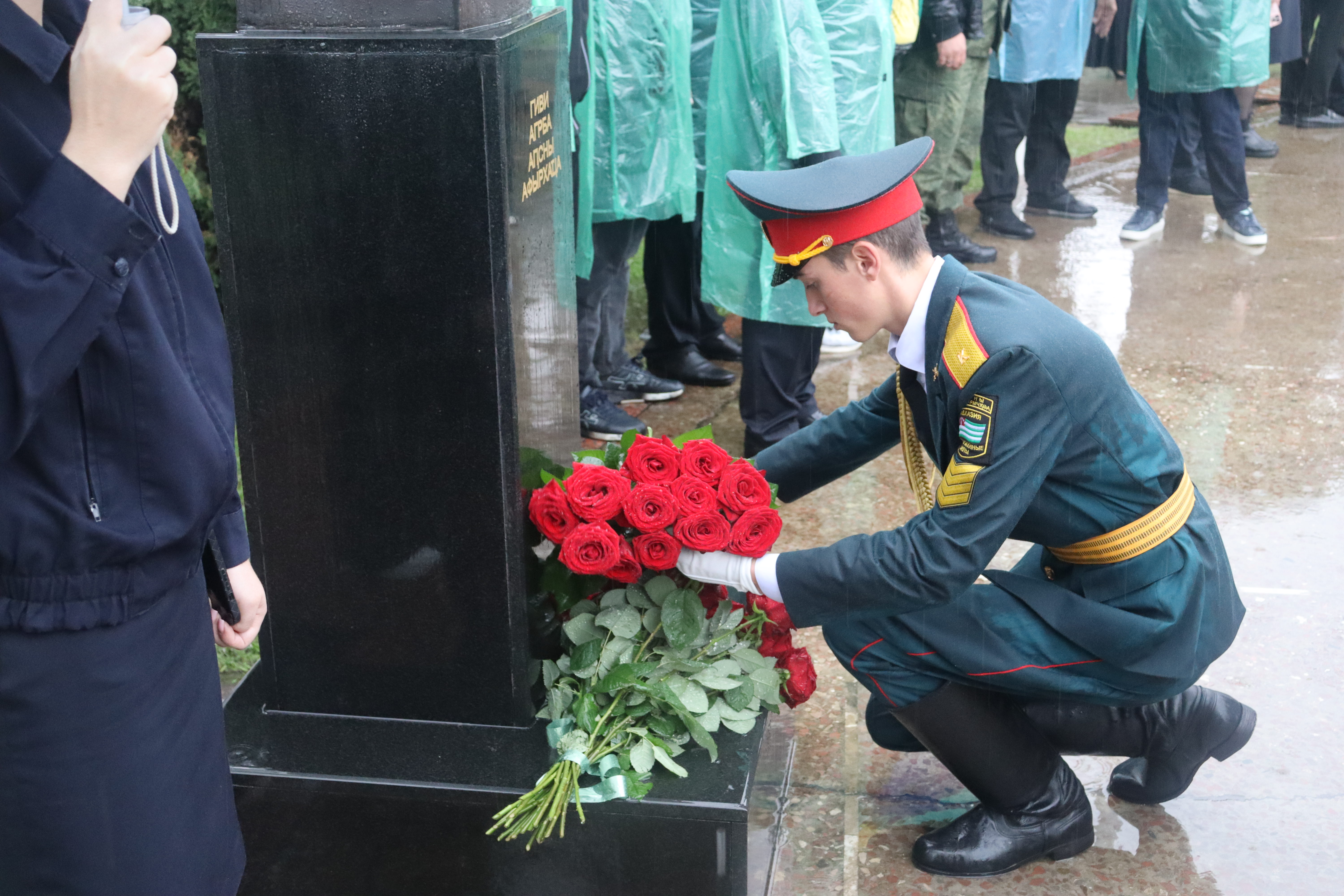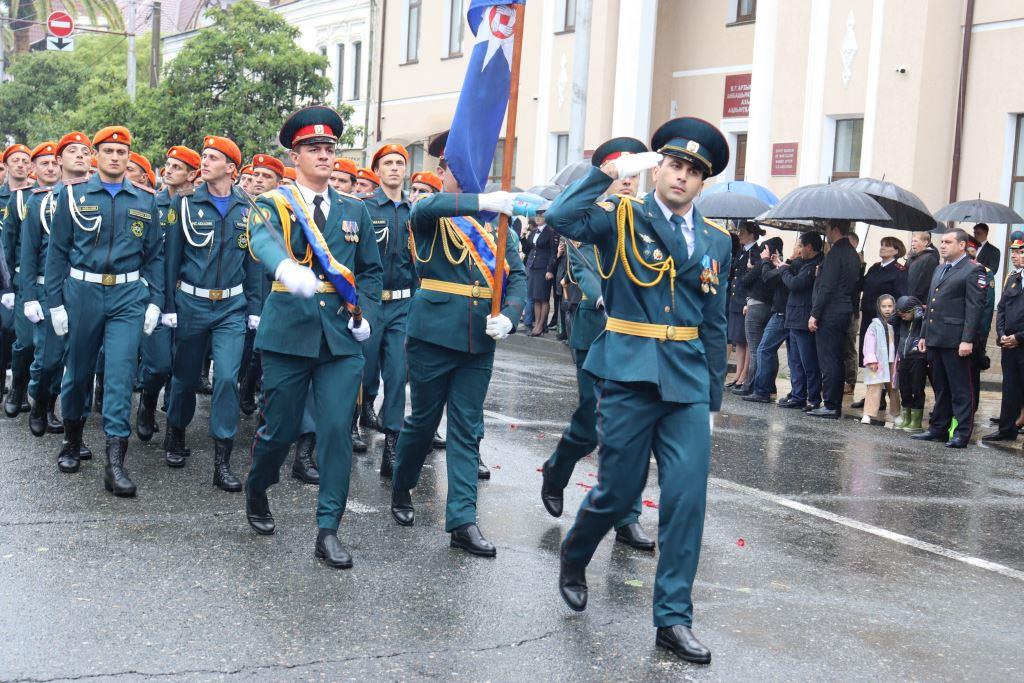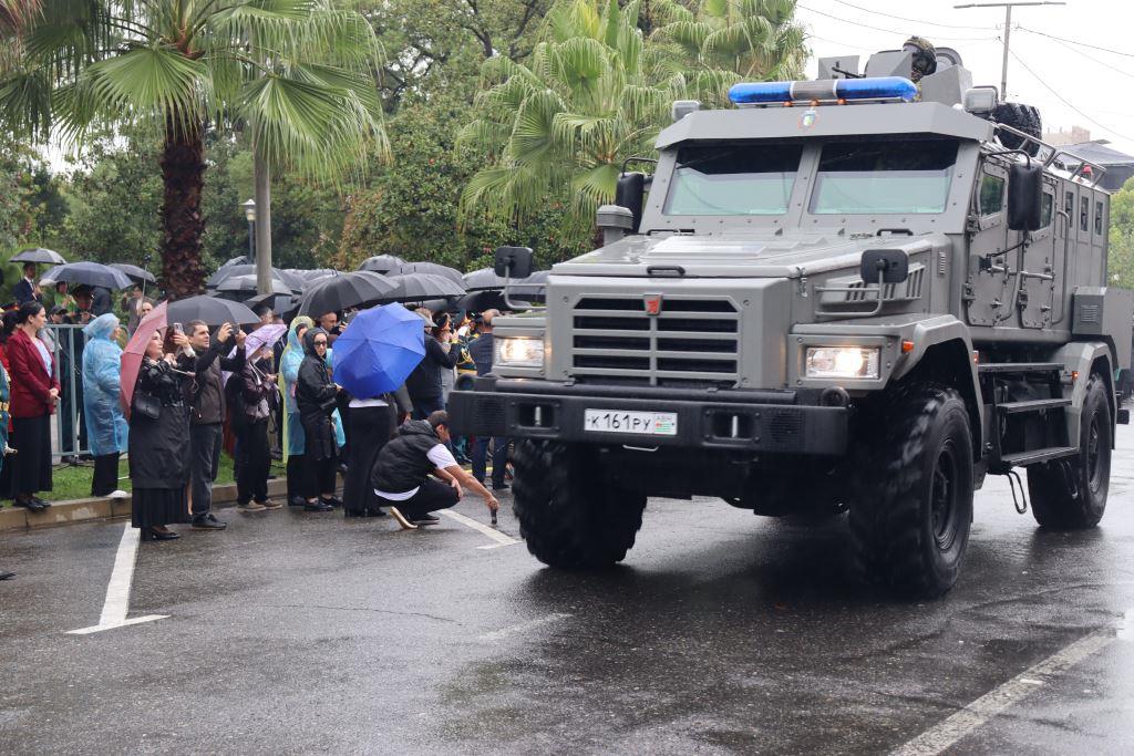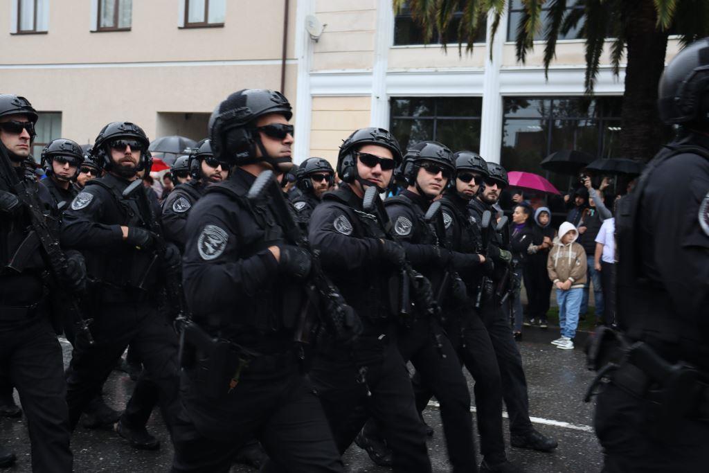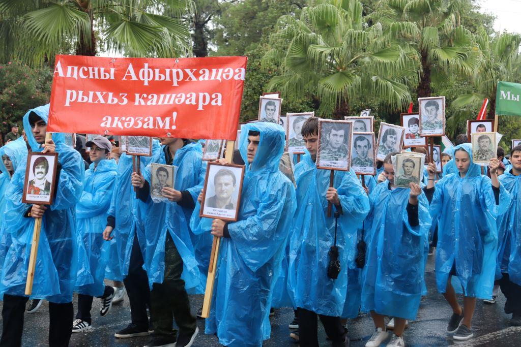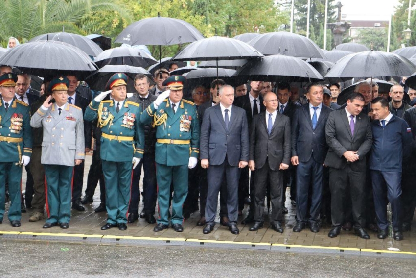 Торжественным маршем по улице Аидгылара прошли парадные расчёты, состоящие из военнослужащих Вооруженных Сил Республики Абхазия и Российской Федерации.
